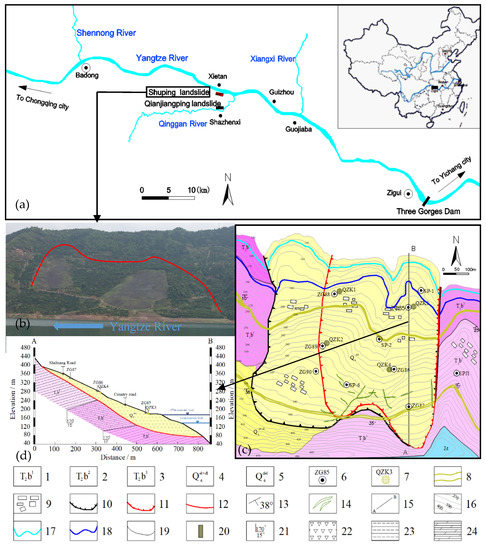 Basic information of Shuping landslide. (a) Location of the Shuping landslide, modified from [31]. (b) Photo of the Shuping landslide. (c) Topographic map of the Shuping landslide displayed at the monitoring stations. (d) Geologic profile of section A–B. Note: 1, Siltstone mixed with mudstone and shale in T2b1; 2, Limestone and marble in T2b2; 3, Mudstone and siltstone in T2b3; 4, Quaternary residual slope deposits; 5, Quaternary landslide deposits; 6, Ground surface GPS monitoring stations and numbers; 7, Deep inclinometer hole and its number; 8, Road; 9, Buildings; 10, Landslide boundary; 11, Landslide boundary of main sliding area; 12, Sliding belt; 13, Rock occurrence; 14, Long ground fissures; 15, Sectional line; 16, Contour elevation; 17, The lowest RWL line; 18, the highest RWL line; 19, Stratum boundary; 20, Road in section; 21, Formation occurrence; 22, Quaternary landslide deposits; 23, Silty mudstone; 24, Argillaceous limestone.