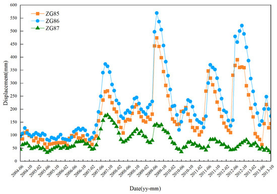 Figure 4 displays the daily displacement change rate in 2007, 2009, and 2012, and the curves of the three monitoring stations exhibit great fluctuation. In June and July each year, the daily displacement change rate of every monitoring station reaches the maximum, and the landslide occurs with serious deformation. Afterward, the daily displacement change rate progressively diminishes. For instance, the daily displacement change rate at monitoring station ZG86 exceeded 12.85 mm/d in June 2012, but was only about 2 mm/d in other months. The analysis reveals that the landslide deformation is characterized by the step-type and is affected by the rise and drop of the RWL and seasonal rainfall.