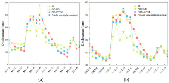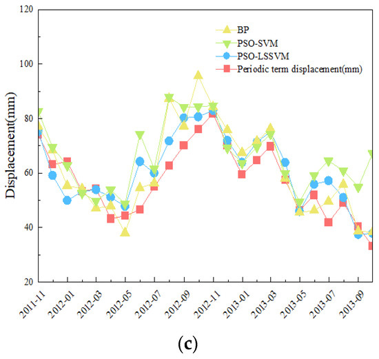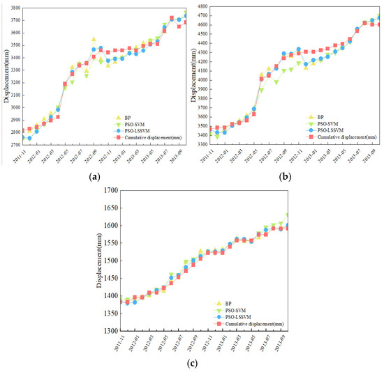 To contrast the applicability of the PSO-LSSVM model, the BP model and the PSO-SVM model are also constructed to predict the PTD of three monitoring stations of the Shuping landslide. The predicted results are shown in Figure 7, and Table 3 shows the error of each model.