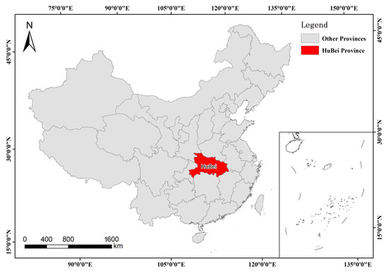 Hubei Province is located in the middle reaches of the Yangtze River and north of Dongting Lake. It extends about 740 km from east to west and 470 km from north to south, and covers an area of 185,900 km2, accounting for 1.94% of the total area of China. It is located in the transition zone from the second step to the third step in China’s terrain. The entire landform of Hubei is an incomplete watershed with three sides high, the middle low, open to the south, and a gap in the north. The province has various types of landforms, including mountains, hills and plains. Among the landform types in Hubei, the mountainous area is the most extensive, covering about 104,000 km2 and accounting for 55.5% of the total area of the province; the hills cover about 45,000 km2, accounting for 24.5%; and the plains cover about 40,000 km2, accounting for 20%. Figure 1 shows the location of Hubei Province.