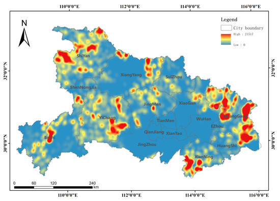 The basic dataset and result dataset of the Flash Flood Disasters Investigation and Evaluation in Hubei Province were collected. In the basic dataset, Hubei Province was divided into 12,321 small watersheds (Figure 3). We could collect the area, slope, elevation, catchment time, flood peak modulus and other attributes of each watershed from the layer. The basic dataset contained land use data and soil type data with a scale of 1:50,000 that can be used to analyze the land use and soil type information of each watershed. The result dataset contained all of the investigation and evaluation results, including flood survey, river channel survey, population and property distribution, flood control capacity evaluation, etc. According to statistics, from 1949 to 2015, a total of 11,925 flash floods occurred in 3649 villages in Hubei Province, and a heat map of flash flood disasters was drawn accordingly (Figure 4). The red area represents a high frequency of flash flood disasters, and the blue area represents a low frequency of flash flood disasters.