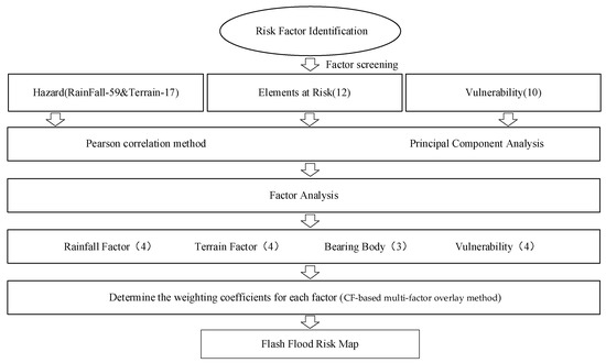 The purpose of this study was to find a feasible risk assessment method based on the Flash Flood Disasters Investigation and Evaluation dataset, reveal the causes of flash flood disaster formation to a certain extent, and identify the key factors affecting flood disasters by making full use of the existing data. The Pearson correlation coefficient mainly analyzes the linear correlation between several factors [21]. Principal component analysis is to describe the most important characteristics of the data with the least data. These calculations are to reduce the data dimensions and eliminate the collinearity impact of the data. Through a series of dimensionality reduction processing, it was helpful for us to find the rules of flash flood formation from the basic data. The CF-based multi-factor superposition method adopted in this manuscript was initially applied to the risk assessment of geological disasters in China [22]. Its research areas include plateaus, mountains, hills and watersheds and involve a variety of landforms and complex geological structures that bear many similarities with areas of flash floods in China.
