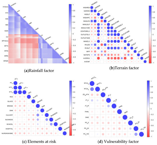 For risk factors such as the rainfall factor, terrain factor, elements at risk, and vulnerability factor, the Pearson correlation coefficient among the factors was calculated. It can be seen from Figure 8a that the correlation between rainfall factors was high, and most of them were strongly positively correlated. Similarly, there was a strong positive correlation between the variation coefficient and modulus coefficient. Correspondingly, there was a negative correlation between these two types of data. It can be seen from Figure 8b that the elevation factor and slope factor were strongly positively correlated, and they were negatively correlated with the average roughness. From Figure 8c,d, the correlation between the elements at risk was not obvious, which was also true for the relationship between vulnerability factors.
