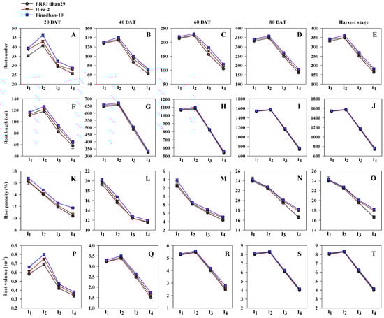 Variable root morphological attributes of three rice cultivars at four irrigation regimes during 20 DAT to harvest stage. I1—Continuous flooding, I2—Saturation, I3—75% of saturation, I4—50% of saturation; (A–E) represent root number; (F–J) represent root length; (K–O) represent root porosity; (P–T) represent root volume.