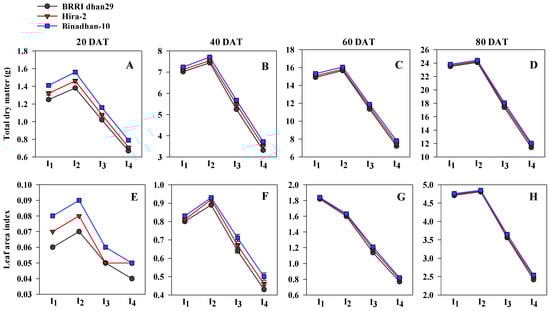 Total dry matter (TDM) and leaf area index (LAI) of three rice cultivars at four irrigation regimes during 20 DAT to 80 DAT. I1—Continuous flooding, I2—Saturation, I3—75% of saturation, I4—50% of saturation; (A–D) represent TDM; (E–H) represent LAI.