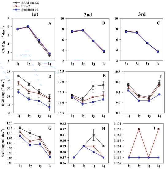 CGR, RGR and NAR of three rice cultivars at four irrigation regimes at 20–40 DAT (1st), 40–60 DAT (2nd) and 60–80 DAT (3rd). I1—continuous flooding, I2—Saturation, I3—75% of saturation, I4—50% of saturation. (A–C) represent CGR; (D–F) represent RGR; (G–I) represent NAR.