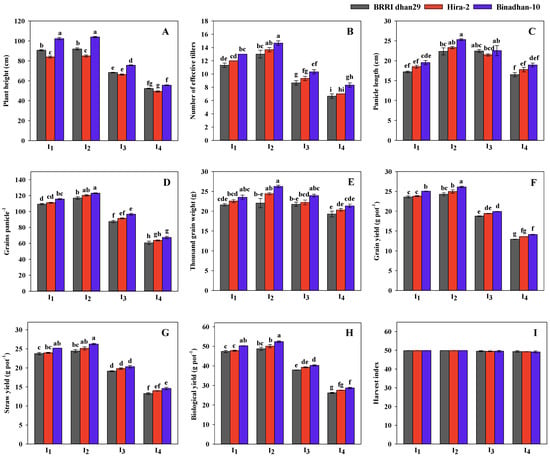 Yield components and output of rice were substantially affected by varieties and irrigation treatments (Table 1). The greatest value of ET (11.58), PL (21.59 cm), GP (100.67), TGW (23.78 g) and GY (21.31 g pot−1) was observed in Binadhan-10, but the least value for all these parameters noticed in BRRI dhan29. Under a different irrigation regime, the S condition produced the largest score of ET (13.78), PL (23.67 cm), GP (120.11), TGW (24.25 g) and GY (25.13 g pot−1), but the minimum value for the same parameters was observed in 50% S. Cultivars and irrigation schemes had a strong interaction effect on yielding components and yield (Figure 4). Binadhan-10 yielded the greatest amount of ET (14.67), PL (25.34 cm), GP (123.00), TGW (26.26 g) and GY (26.13 g pot−1) with S condition, whereas the lowest value for the studied traits was observed in BRRI dhan29 with 50% S (Figure 4). In the case of Biandhan-10, the results revealed that grain yield with S condition was 4.23, 31.11 and 85.19% higher compared to CF, 75% and 50% S, respectively. In the case of BRRI dhan29 GY with S condition, this was 2.88, 29.58 and 88.16% higher compared to CF, 75% and 50% S, respectively, and finally for Hira-2 GY with S condition it was 4.87, 28.51, 83.87% higher compared to CF, 75% and 50% S, respectively.