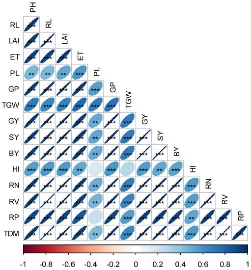 Correlation matrix and heatmap of the root parameters, growth attributes, yield parameters and yield. The ellipses in blue and red represent the positive and negative connections, accordingly. Greater color brightness exhibits the stronger coefficient. The ellipse’s shape emphasizes the extent of homogeneity of the connections. ** and *** indicate 1% and 0.1% levels of significance, respectively. Traits descriptions: PH—plant height; No. ET—number of effective tillers; RN-root number; RL—root length; RP—root porosity (%); RV—root volume; TDM—total dry matter; PL—panicle length; GP—grains per panicle; TGW—thousand grain weight; GY—grain yield; SY—straw yield; BY-biological yield; HI—harvest index.