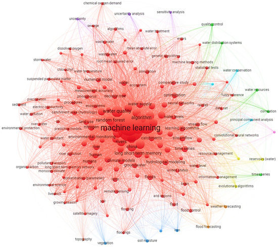 This study adopted a comprehensive systematic literature review to provide a deep understanding regarding the application of ML in the field of WRM. Popular academic databases were used, including arXiv by Cornell University, IEEE Xplore, Directory of Open Access Journals, Science Direct, Google Scholar, Taylor & Francis Online, Web of Science, Wiley Online Library, and Scopus. These databases were selected for the literature search based on the thorough coverage of their articles. Figure 1 was generated using the VOS viewer software to show the occurrences of major keywords on the implementation of ML models in the field of WRM. Because the previous review in this field thoroughly covered the articles published until 2020, this review only considered the articles published between 2021 and 2022. The former was used to obtain comprehensive insights, and the latter was used for reports using the tables in this review.