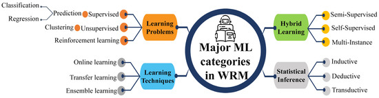 ML algorithms are typically categorized into three main groups: supervised, unsupervised, and RL [5]. A comparison of these is summarized in Table 2. Supervised learning algorithms employ labeled datasets to train the algorithms to classify or predict the output, where both the input and output values are known beforehand. Unsupervised learning algorithms are trained using unlabeled datasets for clustering. These algorithms discover hidden patterns or data groupings without the need for human intervention. RL is an area of ML that concerns how intelligent an agent is to take action in an environment to obtain the maximum reward. In both supervised and RL, inputs and outputs are mapped such that the agent is informed of the best strategy to take in order to complete a task. In RL, positive and negative behaviors are signaled through incentives and penalties, respectively. As a result, in supervised learning, a machine learns the behavior and characteristics of labeled datasets, detects patterns in unsupervised learning, and explores the environment without any prior training in RL algorithms. Thus, an appropriate category of ML is required based on the engineering application. The major ML learning types in WRM are summarized in Figure 2, where the first segment covers the core contents of the research reviewed in the following sections.