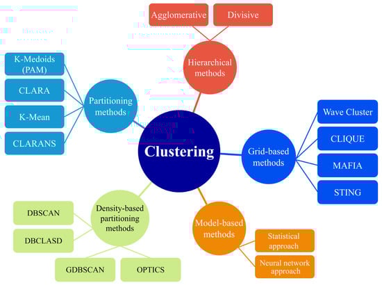 There are numerous discussions of clustering algorithms in the literature. Some studies classify clustering algorithms as monothetic or polythetic. Members of a cluster share a common set of characteristics in monothetic approaches, whereas polythetic approaches are based on a broader measure of similarity [48]. Depending on the algorithm’s parameters, a clustering algorithm may produce either hard or soft clusters. Hard clustering requires that an element is either a member of a cluster or not. Soft clustering allows for the possibility of cluster overlap. The structure of the resulting clusters may be flat or hierarchical. While some strategies for clustering produce collections of groups, others benefit from a systematic approach. Algorithms for hierarchical clustering may be agglomerative or divisive [49]. A dataset’s points are clustered by combining them with their neighbors using agglomerative approaches. The desired number of clusters is attained by repeatedly dividing the original unit in divisive approaches.