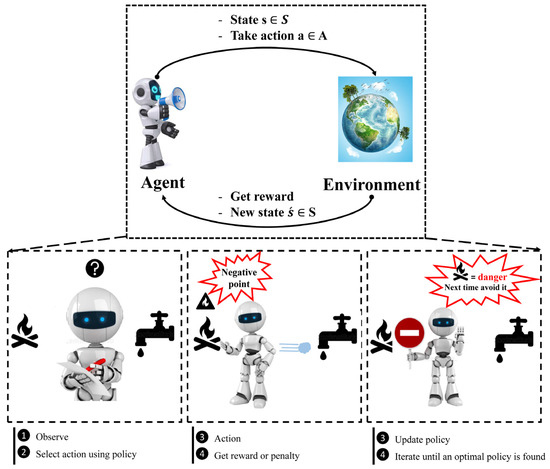This section provides an in-depth introduction to RL, covering all the fundamental concepts and algorithms. After years of being ignored, this subfield of ML has recently gained much attention as a result of the successful application of Google DeepMind to learning to play Atari games in 2013 (and, later, learning to play Go at the highest level) [92]. This modern subfield of ML is a crowning achievement of DL. RL deals with how to learn control strategies to interact with a complex environment. In other words, RL defines how to interact with the environment based on experience (by trial and error) as a framework for learning. Currently, RL is the cutting-edge research topic in the field of modern artificial intelligence (AI), and its popularity is growing in all scientific fields. It is all about taking appropriate action to maximize reward in a particular environment. In contrast to supervised learning, in which the answer key is included in the training data by labeling them, and the model is trained with the correct answer itself, RL does not have an answer; instead, the reinforcement autonomous agent determines what to do in order to accomplish the given task. In other words, unlike supervised learning, where the model is trained on a fixed dataset, RL works in a dynamic environment and tries to explore and interact with that environment in different ways to learn how to best accomplish its tasks in that environment without any form of human supervision [93,94]. The Markov decision process (MDP), which is a framework that can be utilized to model sequential decision-making issues, along with the methodology of dynamic programming (DP) as its solution, serves as the mathematical basis for RL [95]. RL extends mainly to conditions with known and unknown MDP models. The former refers to model-based RL, and the latter refers to model-free RL. Value-based RL, including Monte Carlo (MC) and temporal difference (TD) methods, and policy-search-based RL, including stochastic and deterministic policy gradient methods, fall into the category of model-free RL. State–action–reward–state–action (SARSA) and Q-learning are two well-known TD-based RL algorithms that are widely employed in RL-related research, with the former employing an on-policy method and the latter employing an off-policy method [90,91].