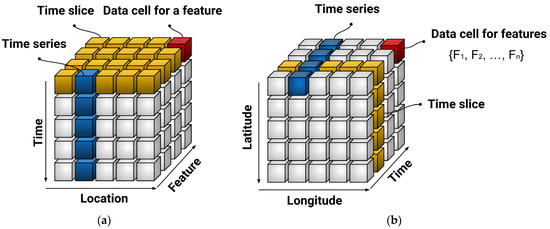 Spatiotemporal studies model and analyze simultaneously how phenomena change over space and time. Due to the fact that they construct a one-dimensional picture of a multifaceted problem, they are of the utmost importance for the development of WRM strategies. In recent years, the emphasis on ML-driven spatiotemporal analysis tools has increased significantly. This is mainly due to the significant technical advancements made in the implementation of new assets, such as sensors and online devices that collect geographical and temporal data. At the beginning of the training process for an ML model, the input data are annotated with geo-spatial and temporal features. This is done in order to model the data’s dynamics while the machine is being trained. Various techniques have already been developed and formulated in order to make progress toward this objective. Depending on the geo-spatiotemporal context, time data can be presented as a continuous sequence, as a collection of sets that form an n-dimensional shape, or as a hidden component within the dynamic model itself. In the first, the machine can be trained with a single or multiple time series or the observation time can be recorded alongside the model’s other variables as an independent variable. The second type of data includes the date, hour, and minute to facilitate the learning process. In the third scenario, the input data are organized according to the timestamps of the occurrences, increasing the monitoring efficiency. Similarly, geographic coordinates can be used to precisely assign the geo-spatiotemporal characteristics of data. In addition, data inputs can be labeled with geo-spatiotemporal information, or model variables can be explored across discrete cells on different grids. Each of these methods can be used to train a variety of algorithms; the most appropriate method typically depends on the available modeling environment and library resources, as well as the individual’s preferences. Overall, the features of spatiotemporal and geo-spatiotemporal frameworks are instructed to consider time and location labels in spatiotemporal and longitude and latitude in geo-spatiotemporal frameworks, as depicted schematically in Figure 7a,b, respectively.