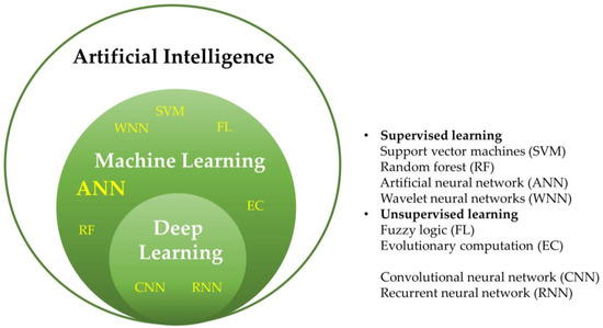 AI algorithms have been utilized in urban flood fields to develop data-driven models that can provide timely prediction of the imminent incidences of flash floods [52]. Many AI systems rely on machine learning methods, and deep learning is a new method for machine learning (Figure 3). The deep learning method analyzes and learns by establishing and simulating the neural network of the human brain. Compared to traditional machine learning methods, in which features are first manually extracted from data, deep learning methods can learn these features while training a large amount of data [53].