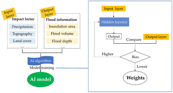 Common AI models involve three main layers: input, hidden, and output layers (Figure 4). The output layer contains data on flood variables, such as inundation area [54], flood volume [9], and flood depth. The input layer contains data on feature factors that may impact flood variables, such as precipitation [9], topography [55], normalized difference vegetation index (NDVI) [50], soil moisture, land use type (or imperviousness) [56], and urbanization level, which can be identified by correlation analysis. Although various input data can be provided to train a model, a systematic investigation should be considered to determine which inputs are optimal to predict flood variables [49]. AI algorithms and network structures are trained in one or multiple hidden layers to determine the appropriate weights that describe the relationships between the input and output variables. Flood data that are independent of those used for model training are used to validate the simulation results. After the model is validated to be reliable and accurate, model evaluations can be conducted, including sensitivity analysis of the model parameters, uncertainty analysis of the simulation results, and comparisons with other models. Furthermore, the validated models can be used to provide flood warnings, flood risk assessments, and advice for landscape planning.