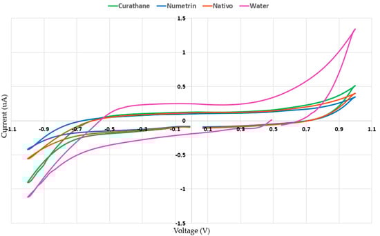 Cyclic voltammograms acquired through a bipotentiostat using the carbon sensor (C110) to detect pesticides (Curathane, Numetrin, and Nativo) and distilled water.