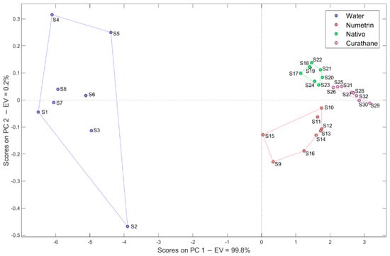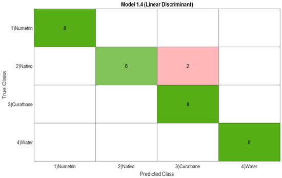 Figure 5 illustrates the result with the linear discriminant analysis classification method, which obtained 93.8% accuracy in the data set, where two Nativo samples were misclassified with the Curathane samples.