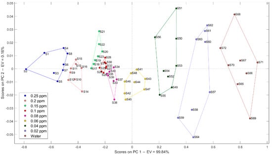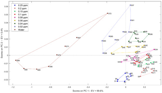 Through the processing of the pesticide categories, implementing the concentrations (0.02 to 0.25 ppm) of Curathane, it was possible to determine by projecting the measurements in the PCA graph from the selectivity and repeatability in the measurements during this analysis. It was observed that lower concentrations increase the degree of dispersion compared with samples with higher concentrations because the electrode responds differently to chemical compound concentrations when detached from their active layer (see Figure 8). In contrast, in the detection of compounds with higher concentrations, there is greater repeatability as the sensitivity is higher in each of the electrodes, and the recovery is more noticeable.