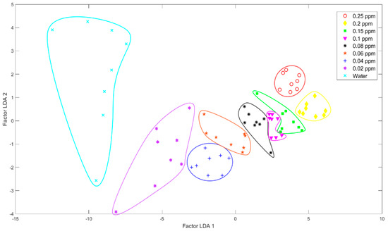 Similar to the PCA, Figure 9 shows a good classification of the Curathane concentrations and the distilled water samples using LDA analysis. As noticed in the PCA graph, in the extraction of factors with more than 90% variation in Factor 1, the ability of the electronic language to identify the different classes of concentrations is confirmed. In this case, the data autoscaling normalization method was applied.