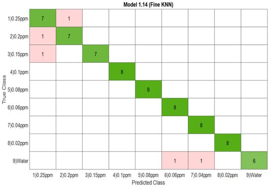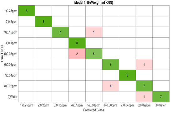Figure 10 illustrates the result of data classification using the kNN (kernel-weighted) classifier, which has obtained a success rate of 91.7% with k-Fold = 5. In this situation, the “scores” were used to reduce the data set dimensionality and extract relevant information from the new matrix. As seen in the graph, the classification generated six errors; there was only some overlapping in the samples of 0.15 ppm with a concentration of 0.08 ppm, 0.08 ppm with a 0.01 ppm concentration, 0.02 ppm with 0.06 ppm, and eventually, a distilled water sample with 0.02 ppm. Despite the errors, there were few failures in classifying Curathane concentrations, obtaining a reasonable success rate.