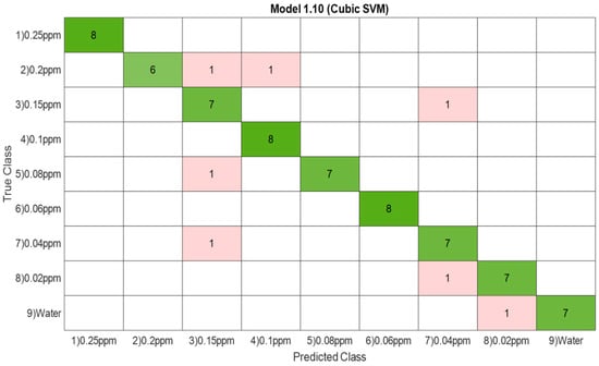 Confusion matrix obtained by applying the medium Gaussian–SVM model for classifying pesticides against distilled water samples.