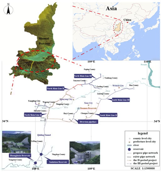 The HWWD Project is a typical trans-basin water-diversion project. Additionally, it is also a milestone in the history of water conservation projects in terms of engineering quantity and technical difficulty around China. The whole project is composed of two parts, one is the water diversion project, and another is the water transport and distribution project. The diversion project consists of three parts, namely the Sanhekou Reservoir, Huangjinxia Reservoir, and Qinling underground water-transmission tunnel. The water transportation and distribution project consists of the Huangchigou pivotal project, the south and north pipeline of the Weihe River, and the corresponding branch pipeline (Figure 1). The HWWD Project and the reservoirs in the receiving area together meet the water requirements for the receiving area.