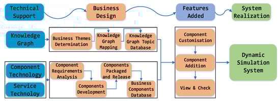 Based on the CIP, we drew a knowledge graph by combining various elements of project’s topology relationship and calculation process. Its elements include three parts: the point, line, and surface. According to the logic and function of each computing or business node in the calculation flowchart or topology diagram, we used Java, SQL, and other programming languages to compile components in the development-tool. The compilation of components is the programmatic implementation of the model’s calculation methods. Next, we finished the debug and packaged, uploaded, and published components to the server. Then, we customized the components on the CIP and added them to the related knowledge-graph nodes to complete the simulation of the data flow to the water flow. The construction process of the simulation calculation system is shown in Figure 2.