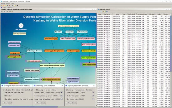 According to the simulation system’s construction principles and process, we constructed the dynamic simulation system of water-supply volume for the HWWD Project. The computational-components net of the simulation system is shown in Figure 4. The simulation-calculation system gradually and visually presents the calculation process of water-supply volume. The decision-makers can click on any node in the calculation flowchart to check the calculation results, and the simulation system can calculate this node progressively. This computing paradigm makes the calculation process more clear and transparent, for example, by clicking the Huangjinxia Reservoir node and checking the calculation results of Huangjinxia Reservoir.