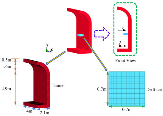 In order to accurately simulate the impact of flowing ice on the water conveyance tunnel in the water medium, the energy consumption of the water medium was reduced, and then more real collision results were obtained. In the calculation of the ice–tunnel collision angle, the forward collision form was adopted to reduce the blocking effect of the water medium. Considering that the impact of ice on the tunnel lining is mainly in the X-direction in practical engineering, the initial velocity of ice was in the X-direction in this simulation to provide power for the ice. In order to reduce the calculation time, the model was simplified, thus ignoring wind and air temperature. Second, in order to avoid the penetration phenomenon at the beginning of the collision and ensure small energy loss during movement of the drift ice, the distance between the drift ice and the tunnel in the X-direction was set to 0.005 m in the simulation. The additional mass diagram and flow−solid coupling model diagram of the ice-tunnel collision are shown in Figure 1 and Figure 2.