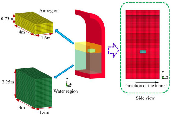 The collision between drift ice and a water transfer tunnel is a complex dynamic response process. Considering the efficiency of the solution and the accuracy of the calculation and the fact that the tunnel is a symmetrical structure, this paper establishes half of the tunnel for the solution and analysis based on the actual project. As the tunnel is generally in a water body environment, when it is hit by drift ice, the presence of the surrounding water medium will have a damping effect on the structure, which not only affects the dynamic response characteristics of the tunnel structure but also, when the drift ice hits the tunnel at a certain speed, the fluid dynamic load will impact the movement of drift ice through the coupling algorithm, while the movement of the drift ice will cause energy changes in the fluid. Therefore, in this paper, the effects of the additional mass model without considering the water medium and fluid–solid coupling model considering the water medium are explored separately. The principle of the additional mass method is to ignore the water medium during modelling and attach the dynamic effect of the water medium to the drift ice in the form of additional mass to improve calculation accuracy while reducing modelling time. At present, there are many studies on ship–ice and ship–ship collision by additional mass method. Motora [27,28,29] found that the additional mass m of the impacting motion hull is small compared with the hull mass mo, only accounting for 2–7% of the hull mass, as, the longer the impact time is, the larger the additional mass is, while the ice–tunnel impact time is very short. Therefore, in this paper, the additional mass coefficient was set at 0.02 to carry out the additional mass of drift ice Δm calculation in the simulation by adjusting the drift ice density parameters to change the unit volume of drift ice mass [30], as well as through Equation (10) to complete additional mass of the conversion calculation. The fluid–solid coupling model, i.e., considering the dynamic load effect of the water medium on the tunnel lining structure in the actual project, was used to establish the water and air domains, respectively. Second, in order to improve the solution efficiency, only the influence of the water medium on the collision in the collision region was considered. Therefore, a 4 × 1.6 × 0.75 m3 air domain model and a 4 × 1.6 × 2.25 m3 water domain model were selected. The air domain is not selected as the full domain, but a layer of 0.75 m thickness is selected for calculation and analysis because, by observing the natural drift ice, most of the floating drift ice is immersed in the water medium, only a small part is in the air medium, and this paper studies the impact of small- and medium-sized drift ice on the collision of the water transfer tunnel, so the impact of the air domain on the drift ice is small, and, based on the flow–solid coupling method used in this paper for calculation and analysis, if the Eulerian grid is too much, the computation time of fluid–solid coupling will be greatly increased. Therefore, this paper selects part of the air domain for calculation and analysis of the whole model under the condition of ensuring the accuracy of the collision results.