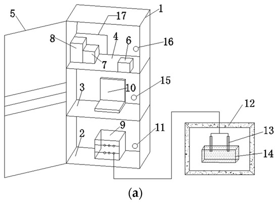(a) Test setup diagram. 1. Instrument mounting cabinet. 2. Dynamic strain tester mounting table. 3. Computer mounting table. 4. Power system mounting table. 5. Cabinet doors. 6. Pulse transmitter. 7. Stepper motor driver. 8. Stepper motors. 9. Dynamic strain tester. 10. Computers. 11. Main wiring hole. 12. Concrete lining. 13. Strain gauges. 14. Drift ice. 15. Sub-wiring hole. 16. Wiring holes. 17. Open mouth. (b) Test stands and data acquisition and analysis systems.