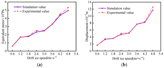 Comparison of simulation and experimental results of different drift ice speeds. (a) Maximum equivalent stress; (b) maximum displacement in X-direction.