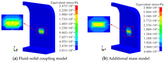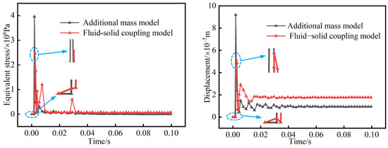 As can be seen from Figure 7 (left), (1) Fluid–solid coupling model, the equivalent stress time curve has obvious dynamic nonlinear characteristics and presents a multi-peak situation. When t = 0~0.002 s, the time course curve of the equivalent stress shows slight fluctuations. The reason for this phenomenon is that the flowing ice hitting the tunnel lining is a gradually approaching process and the water medium between the flowing ice and the tunnel lining will form a high-stress field in advance due to the squeezing effect of the flowing ice movement, which will have an effect on the tunnel lining in advance. In the range of t = 0.00250–0.0305 s, the curve shows an oscillating change with multiple peaks. The reason for this phenomenon is formation of broken ice during the impact process and the influence of waves. After t = 0.00305 s, the equivalent stress is not completely unloaded to zero because the water medium is considered in the calculation. (2) Additional mass model, the dynamic nonlinear characteristics of the equivalent stress–time curve are significantly weaker than those obtained when considering a water medium. The first region of drift ice to come into contact after a drift ice collision will break up first, and the broken ice will fall directly after the ice body breaks up due to the lack of support from the water medium, thus causing a smaller impact. When t = 0~0.000494 s, the equivalent stress–time curve does not change because the collision has not yet occurred. When t = 0.000494~0.0020 s, the drift ice collision begins, and the equivalent stress reaches its peak in a very short time in a nearly straight line, which is shorter than the time taken consider the effect of the water medium. After t = 0.0020 s, the equivalent stress unloads to 0.