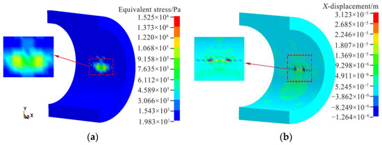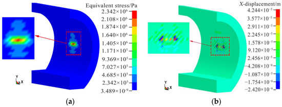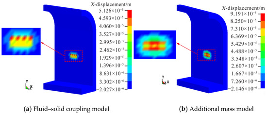 As can be seen from Figure 5 and Figure 6, (1) Fluid–solid coupling model, the velocity of drift ice is 3.0 m/s and the size of drift ice is 0.7 × 0.7 × 0.3 m3. The maximum equivalent stress in the tunnel lining collision zone and the maximum displacement in the X-direction are 2.475 × 106 Pa and 5.126 × 10−5 m, respectively. (2) Additional mass model, the maximum equivalent stress in the tunnel lining collision zone and the maximum displacement in the X-direction are 3.960 × 106 Pa and 9.191 × 10−5 m, respectively, under the above combined conditions.