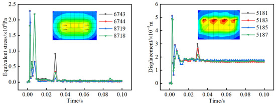 In order to accurately simulate the changes in stress and displacement at other nodes in the impact zone when the drift ice hits the tunnel, the equivalent stress and displacement curves in the X-direction at different locations in the impact zone in the flow–solid coupled model are provided in the figure below.