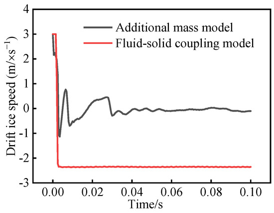 The following figure further provides the time–history curves of drift ice x velocity under different collision models. From Figure 9, the velocity change curves of drift ice in the two different collision models are different. In the fluid–solid coupling model, the velocity of drift ice fluctuates greatly with time due to the action of water body and will gradually return to zero in a short time, while, in the additional mass model, the velocity of drift ice becomes negative instantly after impacting the tunnel liner, i.e., the drift ice is bounced off rapidly, and the velocity remains almost constant in a short time because there is no water medium.