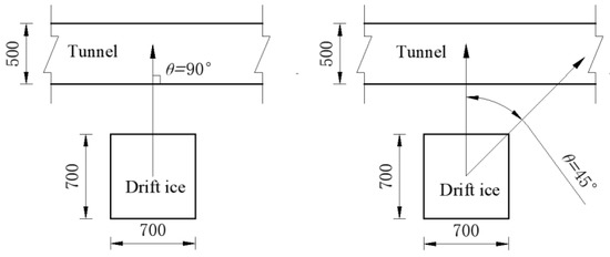 According to the design flow velocity and maximum flow velocity of the tunnel, the velocity of drift ice is 3.0 m/s and the size of drift ice is 0.7 × 0.7 × 0.3 m3. The effect of shear collision between drift ice and tunnel on tunnel lining is investigated. In the finite element simulation, the collision angleθ between drift ice and tunnel is 0° (positive collision), 15°, 30°, 45°, 60°, and 75°, and the collision angle is shown in Figure 10 (θ = 0°, θ = 45° for example) without considering secondary collision and other problems.