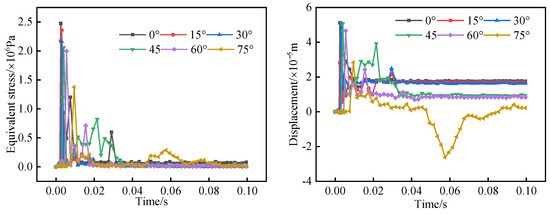 Time–history curves of equivalent stresses (left) and X-displacements (right) for different collision angles.