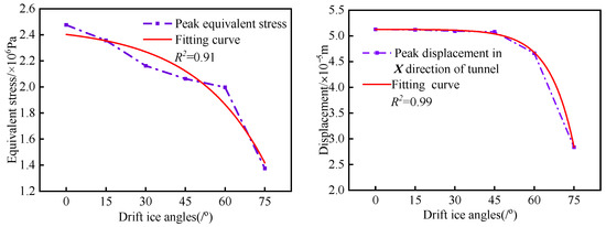 After counting the maximum peaks of the time–history curves in Figure 11, the scatter plots of the peak equivalent stress on the tunnel and the scatter plots of the peak displacement in the X-direction under different drift–ice collision angles are plotted and the curves are fitted. The graphs are shown below.