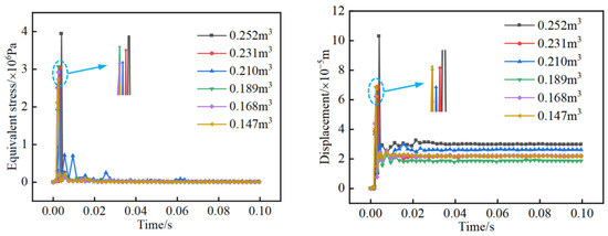 The mechanical properties of drift ice are extremely complex. Jones [35] investigated the effect of ice size on the properties of ice and found that different sizes of ice have certain effects on the mechanical properties and show different “size effects”. Therefore, in this paper, considering the ice conditions of Datong River and referring to Xu Guobin’s research on drift ice, we selected 0.7 × 0.7 × 0.3 (0.147), 0.7 × 0.8 × 0.3 (0.168), 0.7 × 0.9 × 0.3 (0.189), 0.7 × 1.0 × 0.3 (0.210), 0.7 × 1.1 × 0.3 (0.231), 0.7 × 1.2 × 0.3 m3 (0.252 m3), and six other conditions to study the “size effect” of drift ice on the ice–tunnel impact. The drift ice velocity was taken to be 3.5 m/s. The following figure provides the equivalent stress and X-direction displacement time–history curves for different flow ice size working conditions.