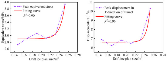 After counting the maximum peaks of the time–history curves in Figure 13, the scatter plots of the peak equivalent stress on the tunnel and the scatter plots of the peak displacement in the X-direction for different flow ice sizes were plotted and the curves were fitted. The graphs are shown below.