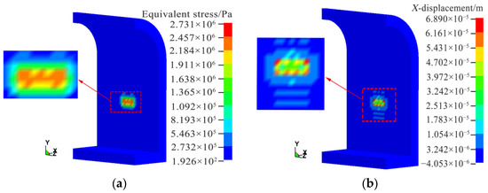 Horseshoe tunnel section. (a) Equivalent stress peak value. (b) Peak displacement in X-direction.