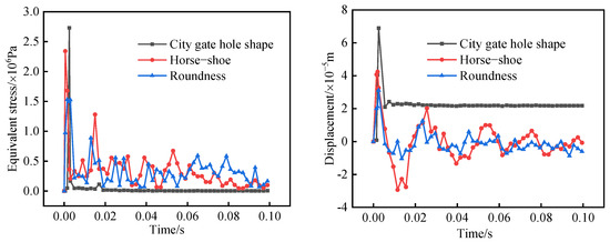 Figure 15a,b shows that the maximum equivalent stress on the lining of Shing Mun Tunnel is 2.73 × 106 Pa, and the maximum displacement in the X-direction is 6.89 × 10−5 m. Similarly, according to Figure 16 and Figure 17, the maximum equivalent stress values of the tunnel lining under the horseshoe shape and circular section are 2.34 × 106 Pa and 1.53 × 106 Pa, respectively, and the maximum displacement values in the X-direction are 4.24 × 10−5 m and 3.12 × 10−5 m, respectively. Further, when drift ice hits the tunnel lining, the city gate type has the greatest influence on the tunnel lining, with the horseshoe shape having the second greatest influence, and the circular section has the least influence. The equivalent stress time–history curve and the X-direction displacement time–history curve of drift ice on the tunnel lining under different cross-sectional forms are shown in the figure.
