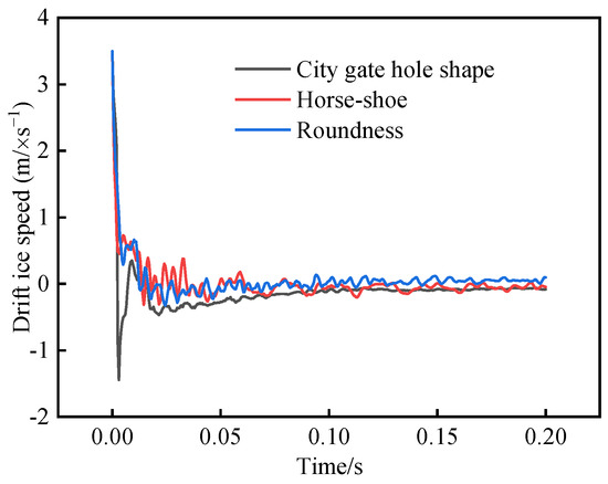 In order to further clarify the influence of water medium on ice–tunnel collisions under different sections, the drift ice velocity during the collision was analyzed, as can be seen from Figure 19, When t = 0~0.00499 s, the drift ice velocity under the three sections showed a linear decrease. The reason for this phenomenon is that the drift ice hitting the tunnel lining is a gradually approaching process, and the water medium between the drift ice and tunnel lining will form a high-stress field in advance due to occurrence of the extrusion effect during drift ice movement; this, in turn, has an impact on the drift ice movement, and the distance between the ice and tunnel was set at 0.005 m, so the drift ice velocity decreased more rapidly. For t = 0.00499~0.05849 s, part of the kinetic energy of the drift ice is transformed into the tunnel lining during the ice–tunnel collision, part of the deformation energy of the drift ice is transformed into water energy and hourglass energy, and the remaining portion of energy is retained as kinetic energy of the drift ice after the collision. As can be seen from the law of conservation of energy, the velocity of the drift ice will not rebound to the initial velocity after the end of the collision. It can also be seen from the figure that the curve shape changes significantly during this time period due to fluctuations caused by perturbations in the water medium. After t = 0.05849 s, the velocity of the drift ice under all three section forms fluctuates around 0 m/s, but, overall, the velocity of the drift ice under the circular section form is greater than that under the horseshoe and Shing Mun cave forms. The reason for this phenomenon is that, due to the circular tunnel structure having the greatest curvature, when the drift ice hits the tunnel, the water medium between the ice and the tunnel is stored to a greater extent, so the drift ice bounces back more with greater repulsive force.