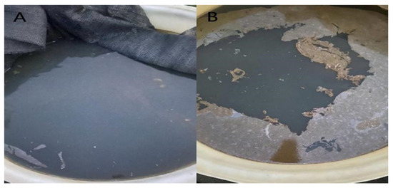 Photographic images of (A) black-odorous water (E), and (B) black-odorous water (F).
