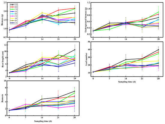 The different water quality had a substantial impact on the subterranean biomass of V. natans (p ≤ 0.05; Table 1). The underground biomass of V. natans in tap water (D) steadily grew over time, whereas the subterranean biomass measured 0.897 ± 0.184 g under low-light-intensity conditions. However, the subsurface biomass in the black-odorous water (E) and black-odorous water (F) showed an increase, followed by a declining phase over time (Figure 3).