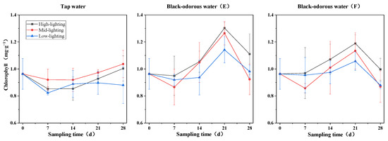On the 14th and 28th days of the experiment, the different water environments and light conditions significantly affected the amount of chlorophyll in V. natans (p ≤ 0.05; Table 2). In tap water (D), the chlorophyll content under medium-light conditions was higher than the chlorophyll content under high-light conditions and lower than the chlorophyll content under low-light conditions. In black-odorous water (E) and black-odorous water (F), the chlorophyll content peaked on the 21st day at 1.303 ± 0.041 mg/g and 1.189 ± 0.063 mg/g, respectively (Figure 5). In comparison to black-odorous water (E) and black-odorous water (F), tap water (D) had no discernible impact on the chlorophyll content of V. natans on the 14th and 28th days of experimentation (Figure 6).
