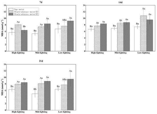 MDA is the end product of membrane lipid peroxidation, which is one of the key indications of membrane-system damage. Its level can reflect the degree of stress injury to plants and its buildup signals a decline in tissue protection [46,47]. Under conditions of stress, the regulating function of reactive oxygen metabolism in plant cells is disturbed, resulting in an increase in free radicals and triggering an oxidative stress response in the plant body in order to adjust to the polluted environment [48]. In this study, the MDA concentration in the black-odorous water was substantially higher than in the tap water (D), showing that the important activities of V. natans are hampered in the presence of black-odorous water.