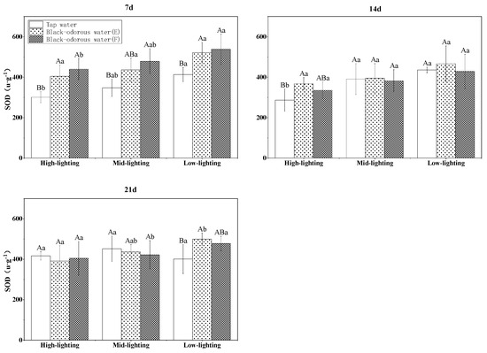 The malondialdehyde (MDA) content of V. natans was significantly affected by changes in the light, water quality/environment, time, and their interactions (p ≤ 0.05; Table 3). On days 7, 14, and 21, the tap water (D)’s MDA level of V. natans was considerably lower than that of the two black-odorous water samples (p ≤ 0.05; Figure 7). In addition, it was also observed that light had no discernible influence on the MDA content of V. natans (Figure 7). The superoxide dismutase (SOD) enzyme activity of the black-odorous water was significantly affected (p ≤ 0.05; Table 3) under the different light conditions, water quality, time, and interaction of water quality and time. On the 7th day, there was a significant difference between the SOD content of V. natans in tap water (D) and black-odorous water (E) and black-odorous water (B) depending on the light intensity (F). However, as time progressed, the SOD activity of V. natans decreased in comparison to the 7th day and did not significantly differ from that of tap water (D) (Figure 8).