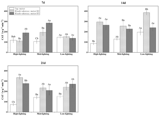 On the other hand, the different light conditions, time, water quality, and their interactions significantly (p ≤ 0.05; Table 3) altered the catalase (CAT) enzyme activity of V. natans. On the 7th day of the experiment, V. natans in tap water (D) under medium-light conditions displayed considerably lower CAT enzyme activity than the two black-odorous water samples. On the 14th and 21st days of the experiments, the CAT enzyme activity levels of V. natans in tap water (D) were significantly lower than those in the two black-odorous water samples. However, under the other two light conditions, the CAT enzyme activity of V. natans in different water environments was essentially the same (Figure 9).